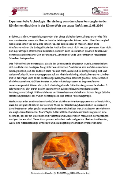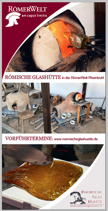 Download: Flyer der Römische Glashütte (PDF)9.11.2025 Vorführung und Schulung am Glasofen Die Römische Glashütte geht danach in die Winterpause. Die neue Saison startet voraussichtlich im März 2026. Einige der in der Römischen Glashütte gefertigten Glasgefäße sind im Museumsshop der RömerWelt am caput limitis in Rheinbrohl erhältlich. ... weitere Vorführungstage werden ggf. kurzfristig hier bekannt gegeben. vergangene Termine: 27. - 28.09.2025 Glastag in der RömerWelt am caput limitis (mit Vortrag "Zur Herstellungstechnik römischer Rippenschalen, mit einer Einführung in die 'Beweisführung' bei der Erforschung antiker Herstellungstechniken"), siehe RömerBlog-Eintrag vom 10.10.2025