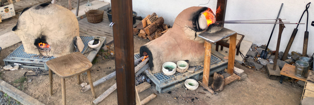 Links der (Ab)Kühlofen, rechts der Glas-Schmelz- und Arbeitsofen. Beide sind holzbefeuert.