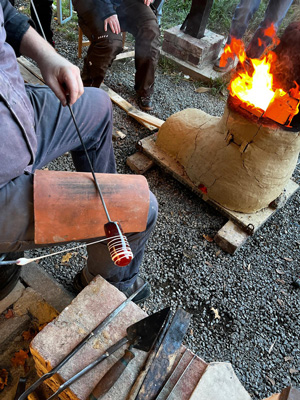 Anlässlich des Kurses "Kerngeformte Glasgefäße in der archäometrischen Forschung und im Experiment" der Ruhr-Universität Bochum wurde im Winter 2024 ein mobiler "XXL-Perlenofen" erbaut. Bei deiser Glasverarbeitungstechnik wird Glas nicht geblasen, sondern auf einem Lehmkern aufgebracht, aufgeschmolzen oder aufgewickelt. Im Unterschied zu den kleineren Perlenöfen verfügt dieser Ofen deswegen über zwei seitliche Arbeitsöffnungen, die es ermöglichen, Glas aus bis zu zwei Schmelzgefäßen zu entnehmen. Auch dieser Ofen erreicht seine Arbeitstemperatur von bis zu 1.100 °C nur mit Holzfeuerung.