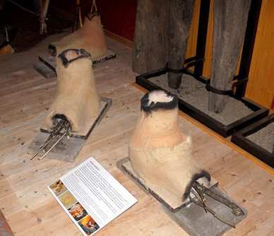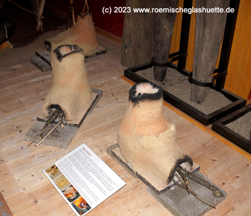Neben den oben vorgestellten Lehmöfen zur Herstellung von Glasgefäßen verfügt die RömerWelt am caput limitis schon seit 2020 über mehrere Lehmöfen zur Herstellung von Glasperlen. Auch diese werden nur mit Holz befeuert und kommen natürlich ohne Holzkohle und Blasebalg aus.